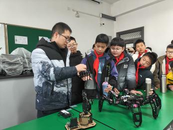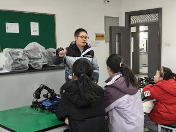 为了让小同学们在轻松愉快的氛围中掌握技能和知识,确保科普教育内容既有趣又能引导同学们思考,人工智能学院实验中心的老师们做了精心准备。活动伊始,实验中心副主任丁云霞和胡锐、黄建超、李康康等老师为来访师生,分项目细致讲解了移动机器人、六足蜘蛛机器人、履带式搬运机器人、感应机械手装置等仪器设备及其原理并进行了操作演示,同时针对同学提出的问题现场答疑解惑。