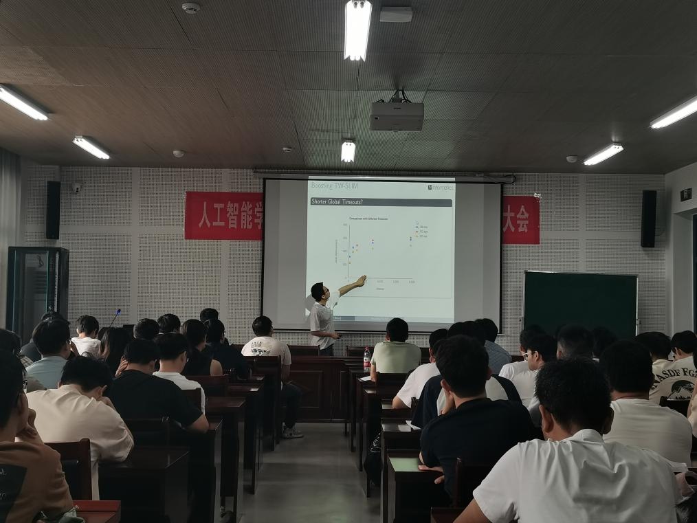 夏海研究员作了《Boosting SAT-based local improvement methods》的学术报告。介绍了SAT-based Local Improvement (SLIM),提出了自适应配置器来提高TW-SLIM的性能以及ICP桥接离线和实时配置器,对SLIM框架进行系统化配置,以提高求解不同计算难度组合问题的效率。
