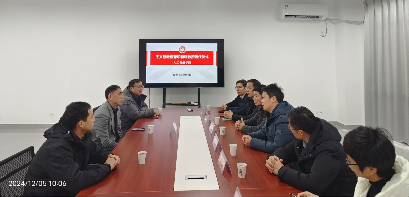 本次论坛还举行了王文新教授人工智能学院兼职特聘教授的聘任仪式。王文新教授与人工智能学院相关领导和教授在研究生招生、一级博士点建立及重点科研项目申请等方面的合作作了深入交流。