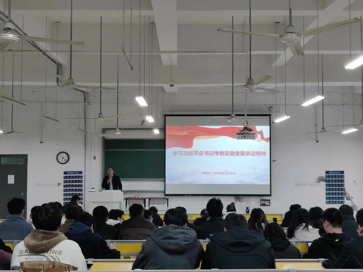 12月10日,人工智能智能学院在天工104邀请马克思主义学院院长朱广亮为全体师生党员作《学习贯彻习近平总书记考察安徽重要讲话精神》学习报告,报告会由学院党委书记张旸主持。全体师生党员160余人参加报告会。