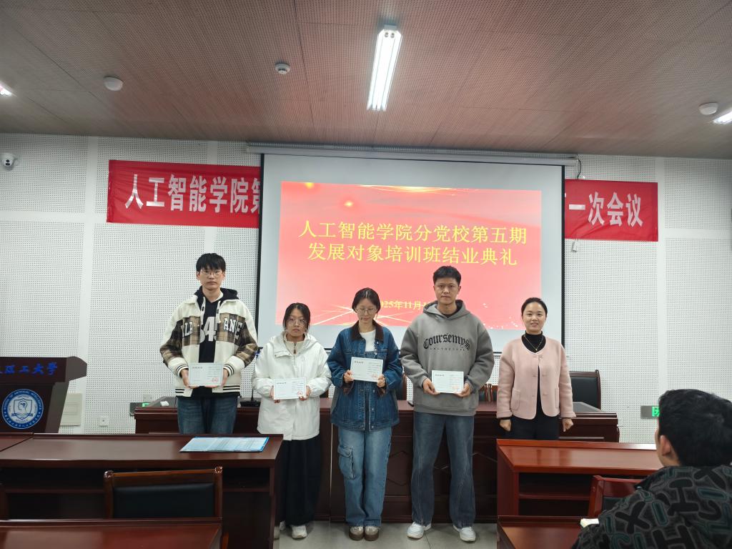 学院党委副书记张晶在结业典礼上为学员颁发结业证书,肯定全体学员在培训期间的认真态度与丰硕成果。她在总结讲话中对学员们提出了三点期望:一是持续强化理论武装,把学习党的创新理论与专业学习紧密结合,不断提升政治素养与理论水平;二是严守纪律规矩底线,将中央八项规定精神与党的纪律要求内化于心、外化于行,以实际行动践行党员标准;三是勇于担当示范引领,立足人工智能学科前沿,在科研创新、志愿服务中当好表率,早日成为合格共产党员。