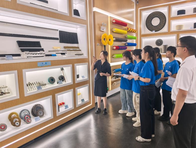 在刷业集群创新和公共服务中心,实践团队跟随讲解员深入探究,切身感受传统制造业依托创新驱动实现高质量发展的显著优势,见证其从传统民用刷到现代工业刷,再到新兴环卫刷的“三级跳” 式发展历程。