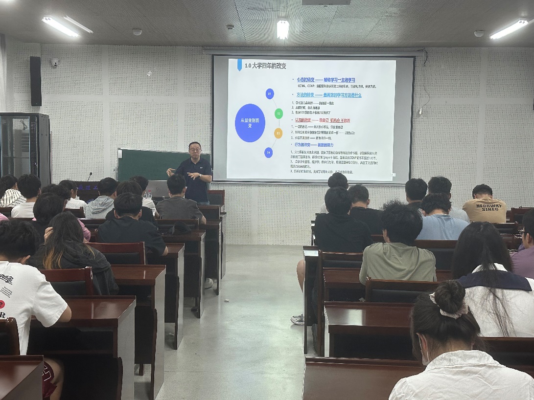 本次活动特邀优秀校友、安徽前行投资管理有限公司董事长兼总经理、我校2005届计算机科学与技术专业毕业生仇轶楠担任主讲嘉宾。他以“人生的三个阶段”为主题,结合自身二十余年的就业创业历程,生动分享了从学生到企业家的蜕变之路。