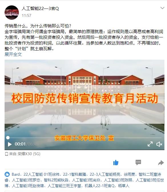 人工智能学院通过班级官方QQ宣传防传销知识,采用文字与视频相结合的形式,就传销的特征、传销危害、传销常用欺骗手段、真实案例及如何防范传销等进行了宣传,号召全体师生行动起来,积极参与反传销活动,自觉抵制传销行为,共建平安美丽校园。