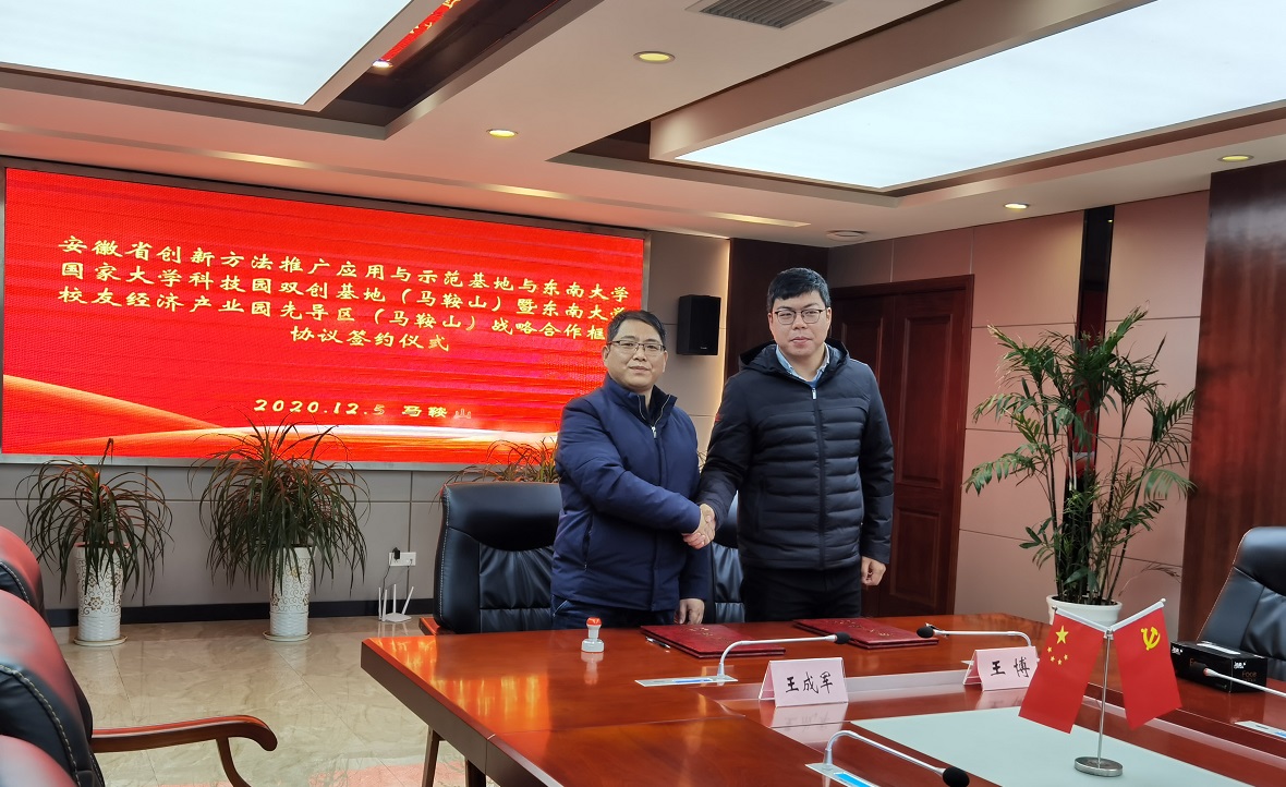 最后,王成军代表安徽省创新方法推广应用与示范基地与东南大学科技园双创基地(马鞍山)暨东南大学校友经济产业园先导区(马鞍山)签订战略合作框架协议。