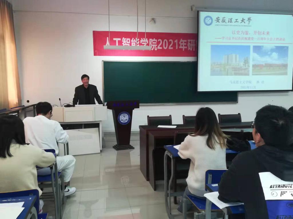 11月20日上午,人工智能学院在崇智楼A125教室开展了党史学习教育专题讲座,邀请学校马克思主义学院党总支书记孙功来院讲授习近平总书记在庆祝建党一百周年大会上的讲话精神,带领在座的全体成员全面回顾习近平总书记讲话内容和重大意义。院党委副书记张瑞兴主持讲座,学院教师党员、发展对象培训班全体学员参加讲座。