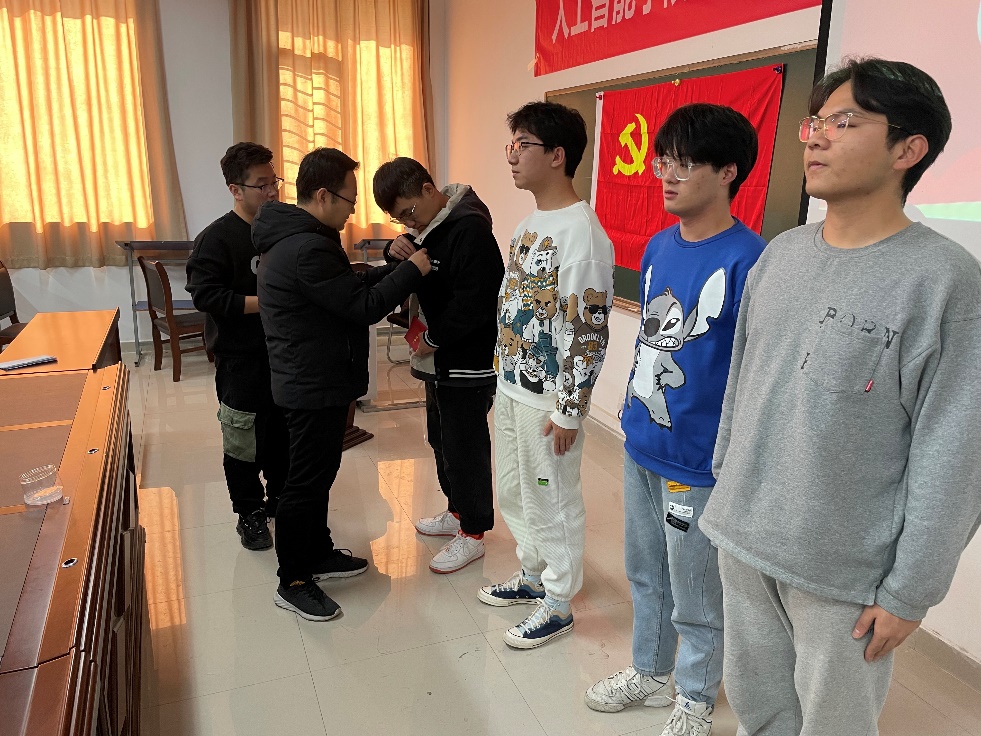 入党宣誓仪式上,人工智能学院党委副书记张瑞兴为35名预备党员佩戴党徽并赠予党章。鼓励大家在工作、生活中主动擦亮身份,注意自己的言行举止,让党徽成为一种鞭策、一种激励,为其担当作为、勇往直前、勇挑重担提供源源不断的力量。