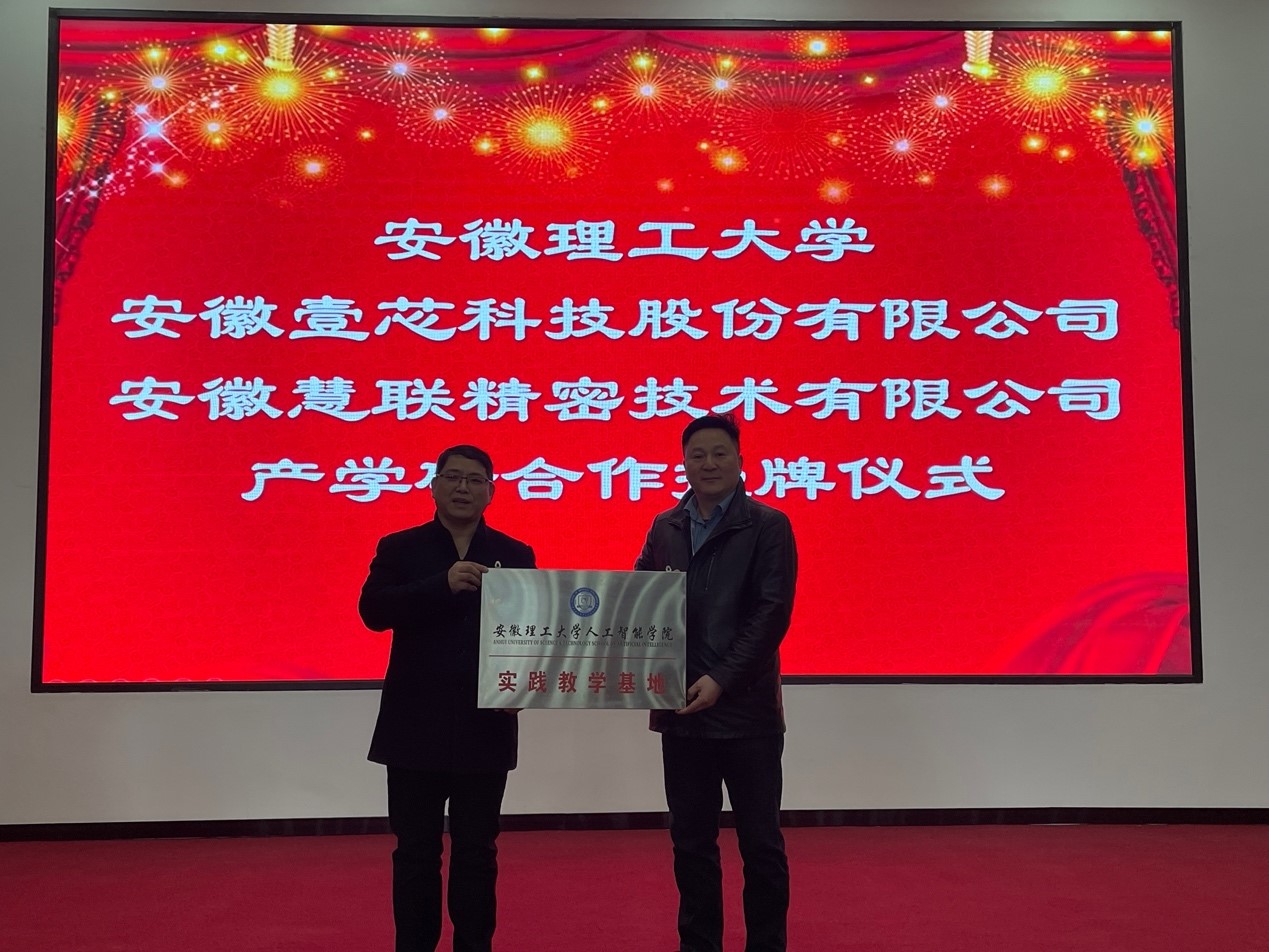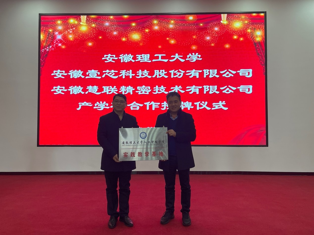 最后,人工智能学院分别与安徽壹芯科技股份有限公司、安徽慧联精密技术有限公司签署了实践教学基地协议书,并举行了“安徽理工大学实践教学基地”的揭牌仪式。