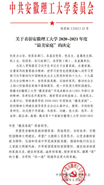 近日,安徽理工大学2020-2021年度“最美家庭”评比工作已结束,共九位教职工家庭获此殊荣,我院张军老师家庭名列其中。
