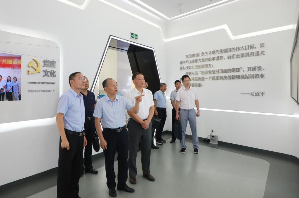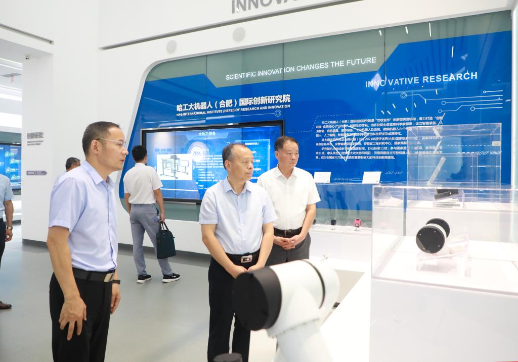 郭永存、宫能平一行还参观了哈工大机器人(合肥)国际创新研究院展厅,听取了研究院发展历程、成果展示、创新研发、成果转化、产业培育、社会贡献等方面的介绍。