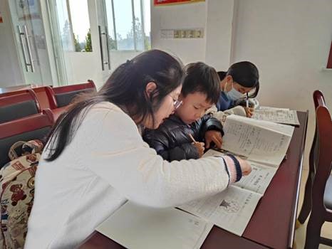 新华村党员活动室摇身一变成了温馨舒适的学习场所,志愿者们正在辅导孩子们做作业。当孩子们遇到难题时,志愿者便耐心地与孩子们共同探讨,帮助他们找到解题思路。活动中有小朋友说道:“我觉得很开心,也很有收获,在这里跟其他同龄的同学们一起做作业,更有学习氛围。而且,有志愿者哥哥、姐姐帮我们辅导作业也更加地方便”。