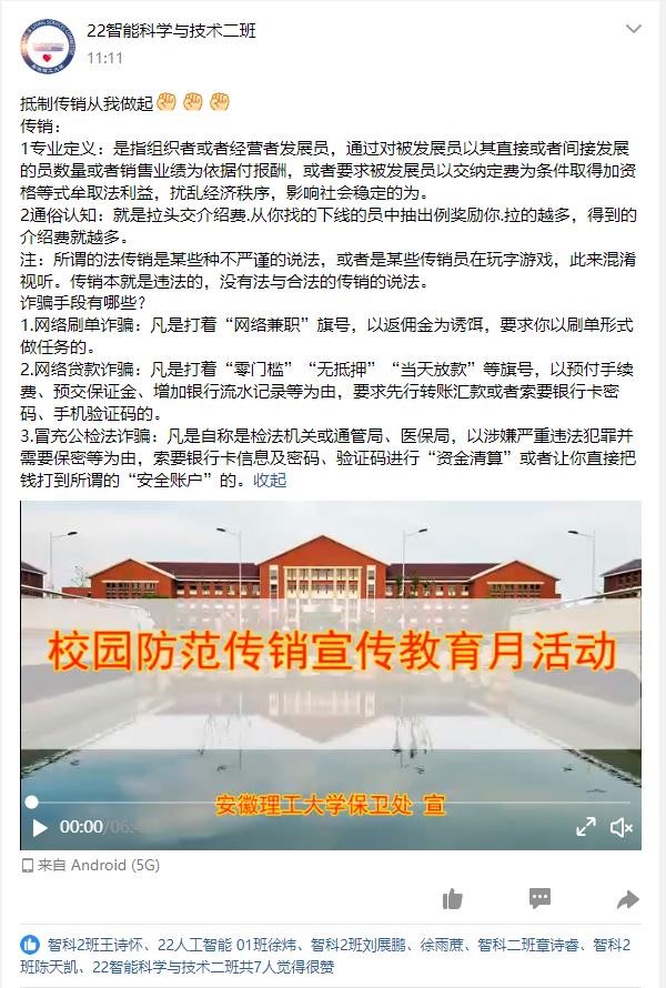 人工智能学院通过班级官方QQ宣传防传销知识,采用文字与视频相结合的形式,就传销的特征、传销危害、传销常用欺骗手段、真实案例及如何防范传销等进行了宣传,号召全体师生行动起来,积极参与反传销活动,自觉抵制传销行为,共建平安美丽校园。