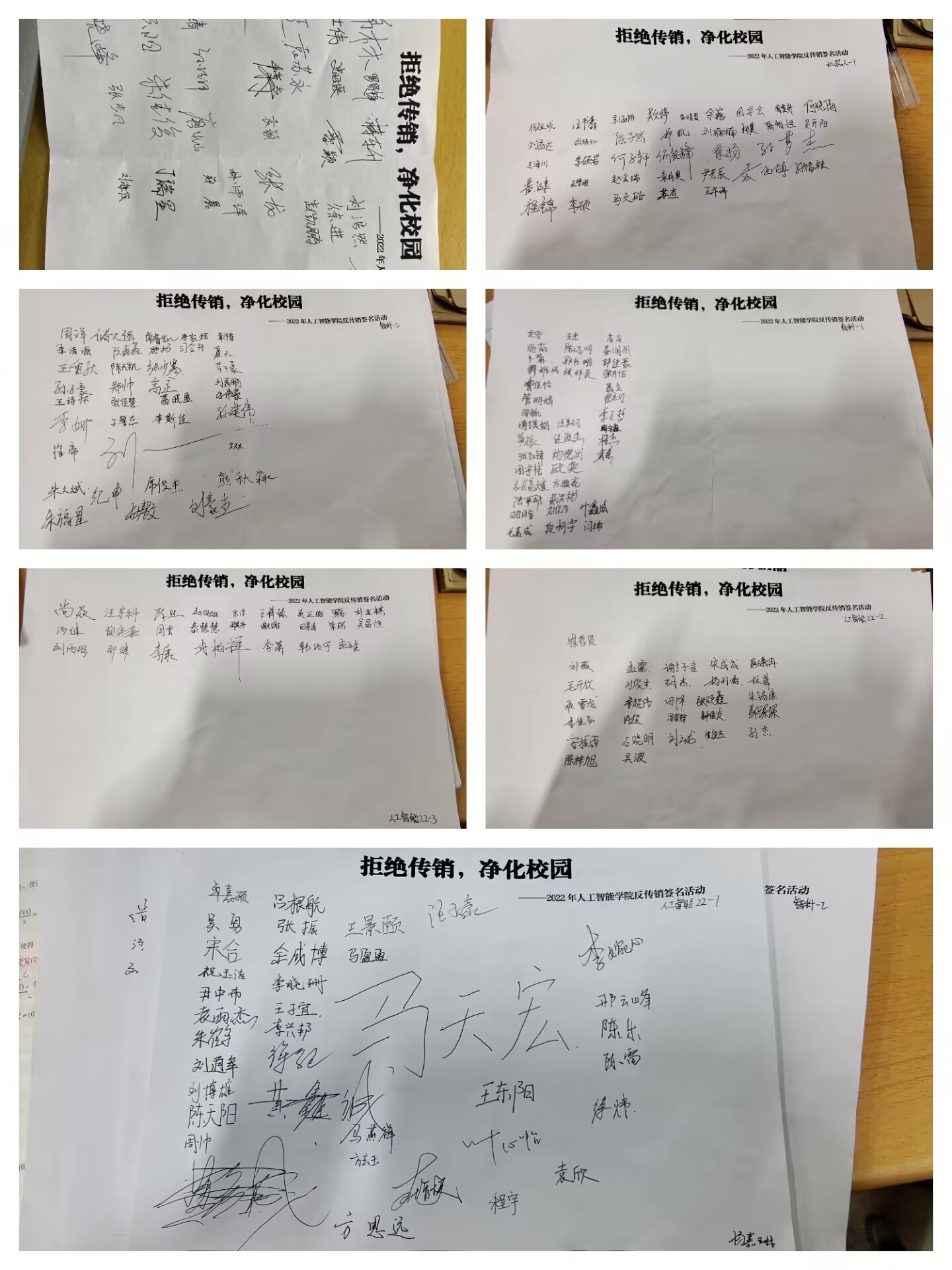 为提高学生安全防范意识,增强对传销的免疫力,2022年9月至12月,人工智能学院结合实际,利用主题班会、网络宣传、辩论赛、签名活动等形式,开展防传销系列活动。