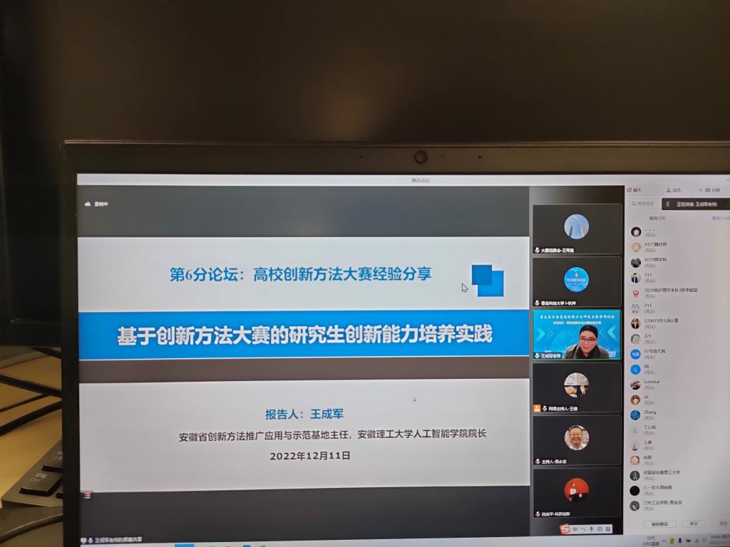 来自清华大学、中国科学院大学、华南农业大学、山东理工大学等全国从事创新方法研究与教学的众多高校参加了此次会议。我校安徽省创新方法推广应用与示范基地主任、人工智能学院院长王成军教授作为特邀专家,在高校创新方法大赛分论坛作了题为“基于创新方法大赛的研究生创新能力培养实践”的报告,近300位学者参加了论坛。