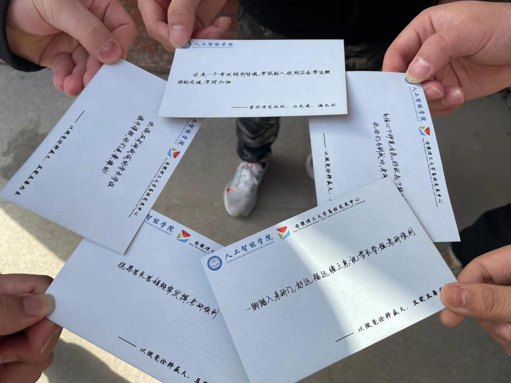 人工智能学院高度重视2019级考研学生的备考工作,学院领导、学业导师以“面对面”“键对键”等方式表达对考研学子的关心与慰问;辅导员经常与考研学子交心谈心,帮助同学们进行心态调适和心理疏导,鼓励大家在考研冲刺的关键阶段调整心态、坚定信心。此次慰问活动学院精心为考研学子准备了“加油包”。其中不仅有各类考试用具,铅笔,橡皮等,还有面包、口罩,以及由大一大二学弟学妹们亲手写的祝福明信片,饱含了人工智能学院全体师生对考研学子的真挚关心与美好祝愿。
