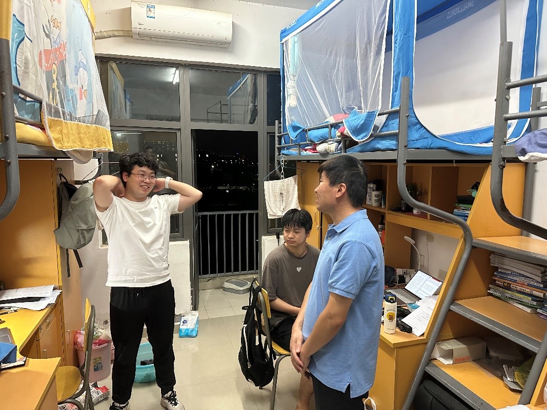 6月12日晚,学院党委书记张旸、毕业班辅导员万煜堃一同前往宿舍楼栋,看望和慰问即将离校的毕业生。