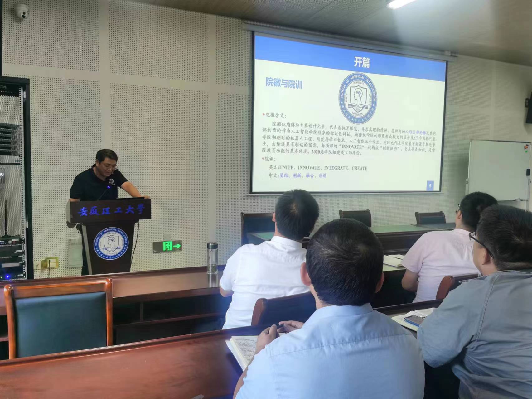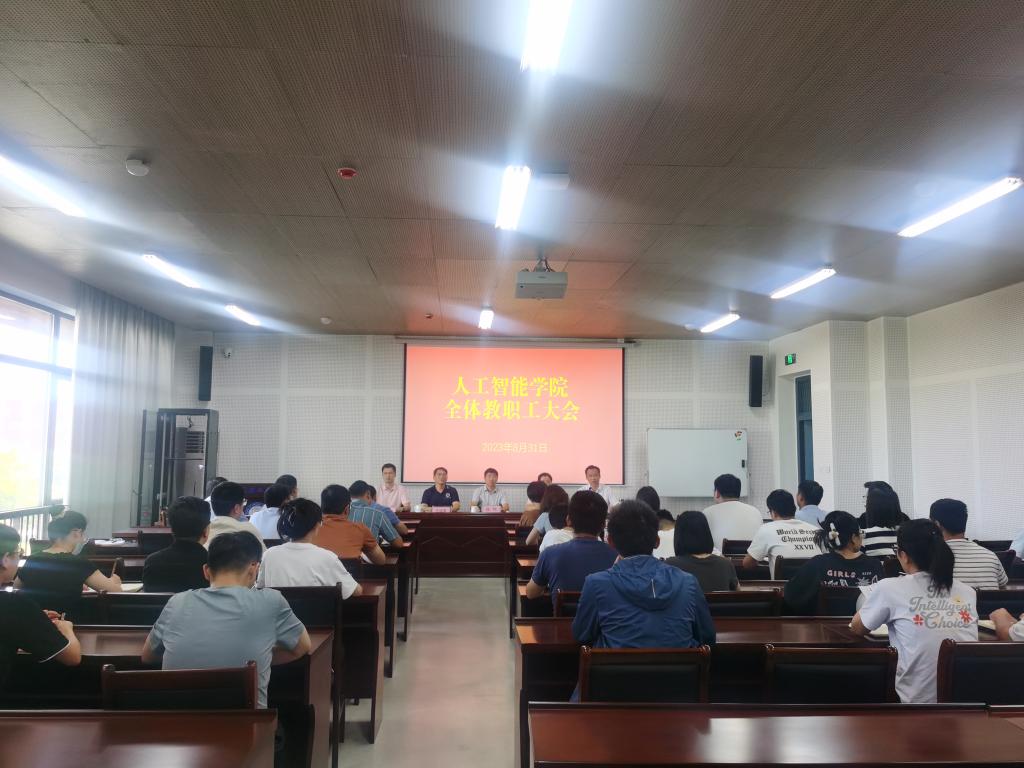 8月31日下午,人工智能学院在明德楼2楼报告厅召开全体教职工大会,学习习近平总书记在中央政治局第五次集体学习时的重要讲话精神,总结暑期工作,部署本学期重点工作。学院党委书记张旸主持会议,学院领导班子成员,全体教职工参加会议。