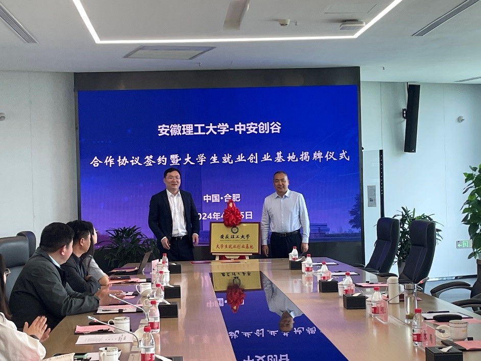 为进一步推动产学研合作,加强高校与企业之间的交流与合作,4月25日,校党委常委、副校长王先江前往位于合肥市的中安创谷进行走访交流,共同探讨人工智能领域的人才培养和未来合作机会。学校和中安创谷就共建“安徽理工大学生就业创业基地”举行了签约与授牌仪式。安徽中安创谷科技园有限公司副总经理蔡昊热情接待了王先江一行。人工智能学院主要负责人和相关工作人员随行。
