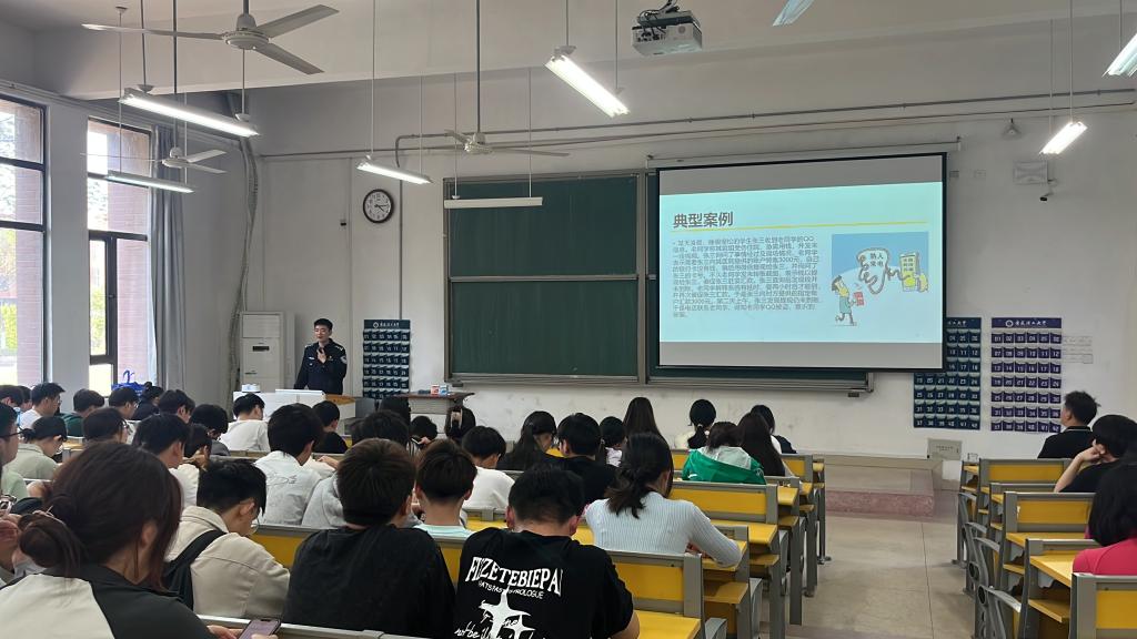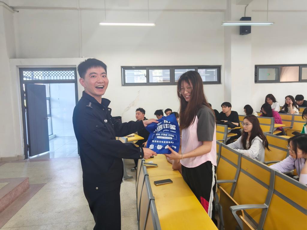 郑宇警官首先播放了反电诈宣传短片,接着从什么是电信网络诈骗、近年来我校的发案情况、常见的电信网络诈骗类型以及如何防范电信网络诈骗等四个方面全方位展开。他结合大量真实的案例,介绍了兼职刷单诈骗、网络交友诈骗、冒充客服诈骗、冒充熟人诈骗、网络购物诈骗等高发的诈骗类型,带领学生深入剖析受害者被骗的原因,了解犯罪分子的各种套路,呼吁同学们要主动学习反诈知识,时刻保持头脑清醒,随时提高警惕,不要轻信他人、不要贪图小利,守护好自己的“钱袋子”。
