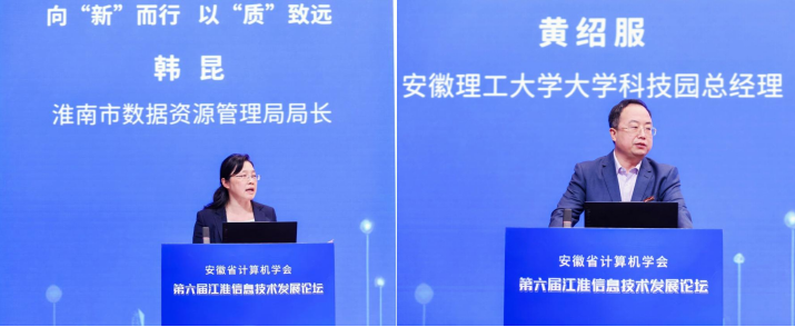 在产业高质量发展论坛中,淮南市数据资源局局长韩昆和安徽理工大学科技园总经理黄绍服分别作《向“新”而行,以“质”致远》、《安理智谷》主题推介,希望以此吸引更多的投资,促进淮南市经济高质量发展,推动教学科研与本地产业深度对接。