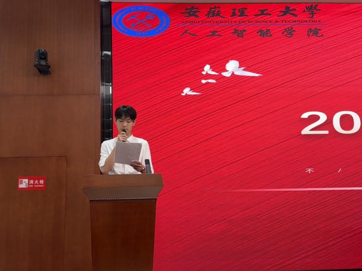 新生见面会在庄严的国歌声中拉开帷幕。随后,智能科学与技术专业2024级新生郑吴悠然、机器人工程专业2024级新生赵远、人工智能专业2024级新生严才顺分别作为新生代表发言。