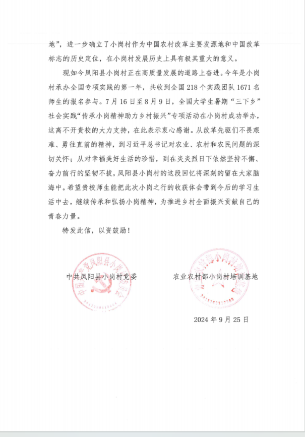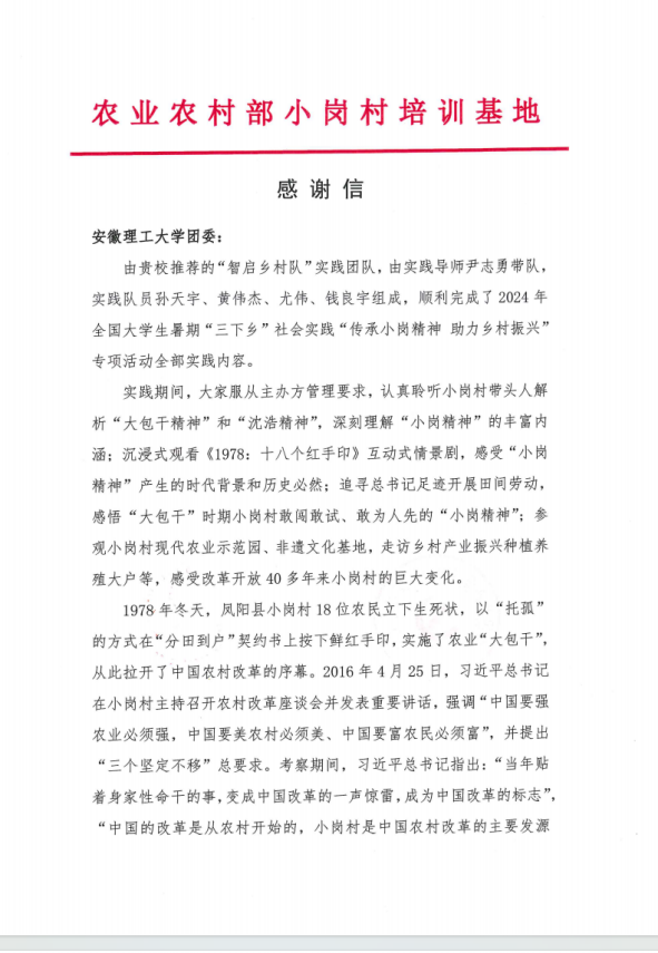 近日,人工智能学院收到一封来自农业农村部小岗村培训基地的感谢信,信中对学院“启智乡村队”实践团队顺利完成2024年全国大学生暑期“三下乡”社会实践“传承小岗精神助力乡村振兴”专项活动表示了祝贺和感谢,充分肯定了人工智能学院的育人成效。