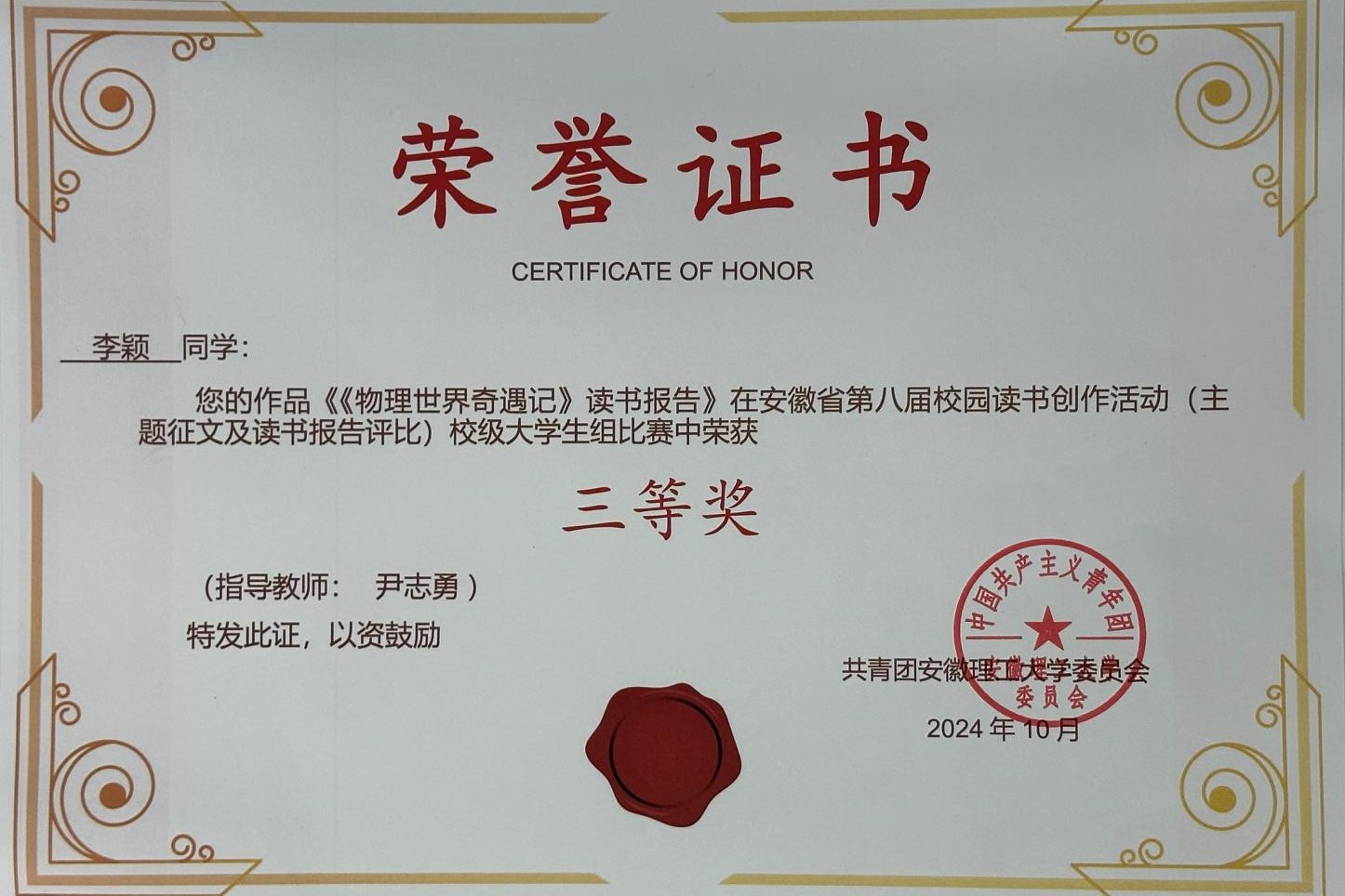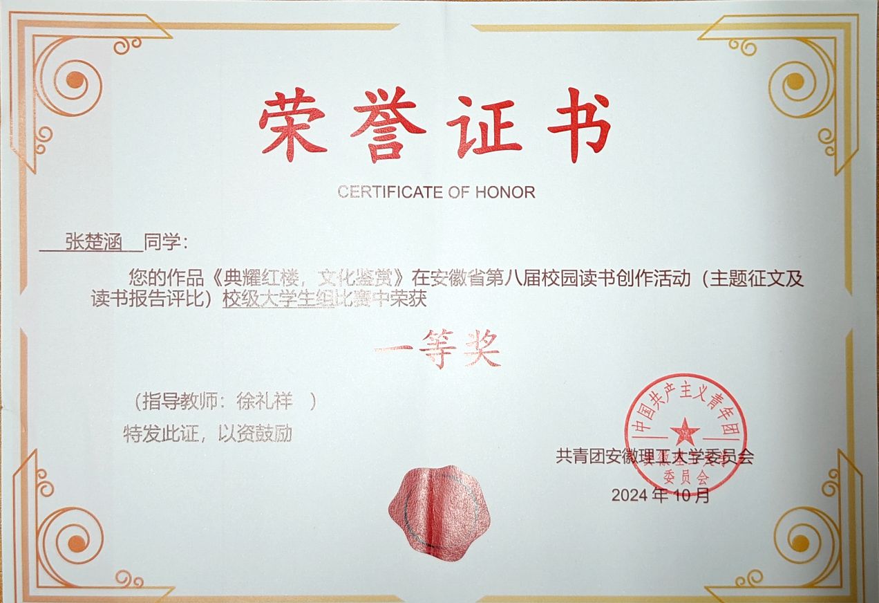 近日,安徽省第八届校园读书创作活动校级决赛成功举办。人工智能学院学子2024级智能科学与技术专业张楚涵、2024级人工智能专业李颖同学凭借出色的文笔以及其指导老师的悉心帮助,经过激烈的竞争,其作品《典耀红楼,文化鉴赏》、《物理世界奇遇记》读书报告分别斩获校级一等奖和三等奖,其中张楚涵同学的作品——《典耀红楼,文化鉴赏》作为我校参赛作品上报安徽省教育厅参加“安徽省第八届校园读书创作活动,期待这篇优秀作品能荣获更高荣誉!