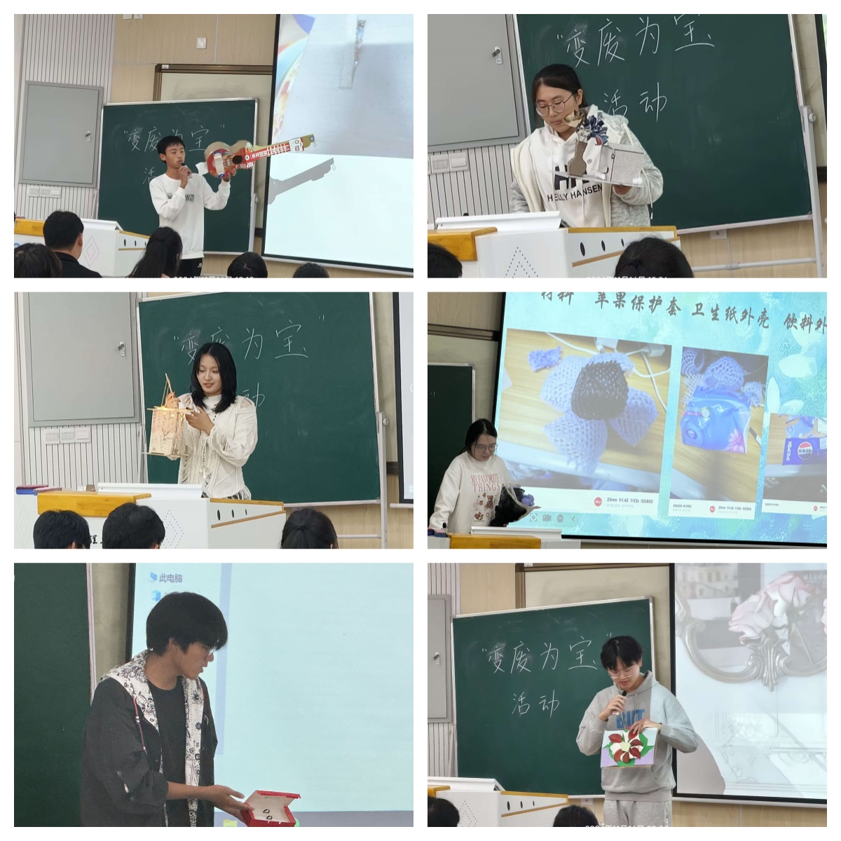 16日晚,一场别开生面的“变废为宝”比赛在耕心楼314教室如火如荼地进行。活动过程中,各院同学踊跃报名,积极参与,本次活动共吸引来自三个学院24名选手参与比赛。参与者们充分发挥自己的想象力和创造力,利用废旧物品,充分发挥创意,制作出具有生活实用、科技创新、心灵疗愈等作用的手工艺品,展示了“变废为宝”的无限可能。他们将这些废旧物品变成了精美的艺术品和实用的小物件。有的参与者用废弃快递盒和手提袋制作成了吉他,有的用银杏叶制作了圣诞树,有的用苹果保护套、卫生纸和饮料瓶制作了花束,还有的用口罩系绳制作了纪念戒指等,每个人都沉浸在自己创作的乐趣之中。