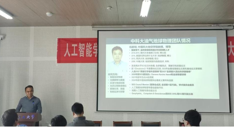 李长河院长首先向大家介绍了伍新明教授主要的研究方向及取得的各项荣誉成果。伍新明教授作了题为《人工智能地球物理—挑战与研究思路》的学术报告,报告围绕人工智能+地球物理+地质等多学科交叉研究进行探讨,包括智能化地球物理数据处理、智能地质解释与建模、储层预测、智能监测等场景,着重探讨人工智能在这些场景应用方向面临的一些挑战、研究思路、研究成果及未来展望。