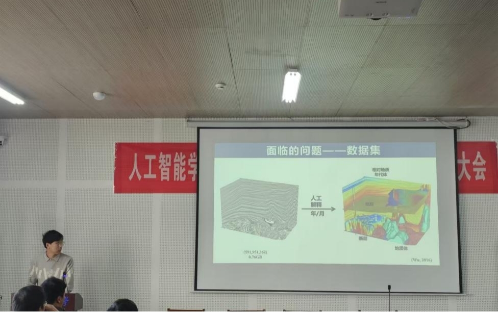 杨佳润博士作了题为《基于多源信息与多任务学习的智能地质解释与建模》的学术报告,报告围绕现阶段制约地质解释与建模智能化发展的主要问题,提出了一种进行溶洞与河道两种重要油气储集体的地下成像数据与标签数据集构建的过程,并通过深度学习进行同时实现两种地质体的准确检测。通过引入专家先验作为多源信息,同时进行两种构造解释任务,大大提高模型的泛化性以及准确率。通过引入LoRA(Low-Rank Adaptation)对原有的多任务学习模型进行微调,基于自监督学习的方法以较小的代价将模型广泛应用到各种实际数据,提高模型的泛化性。