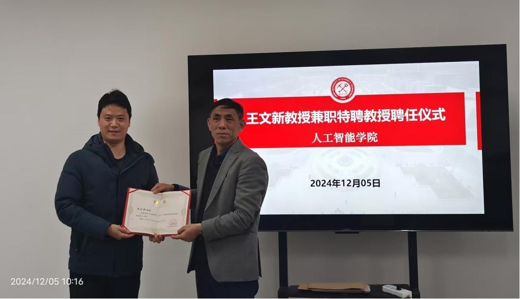 本次论坛还举行了王文新教授人工智能学院兼职特聘教授的聘任仪式。王文新教授与人工智能学院相关领导和教授在研究生招生、一级博士点建立及重点科研项目申请等方面的合作作了深入交流。