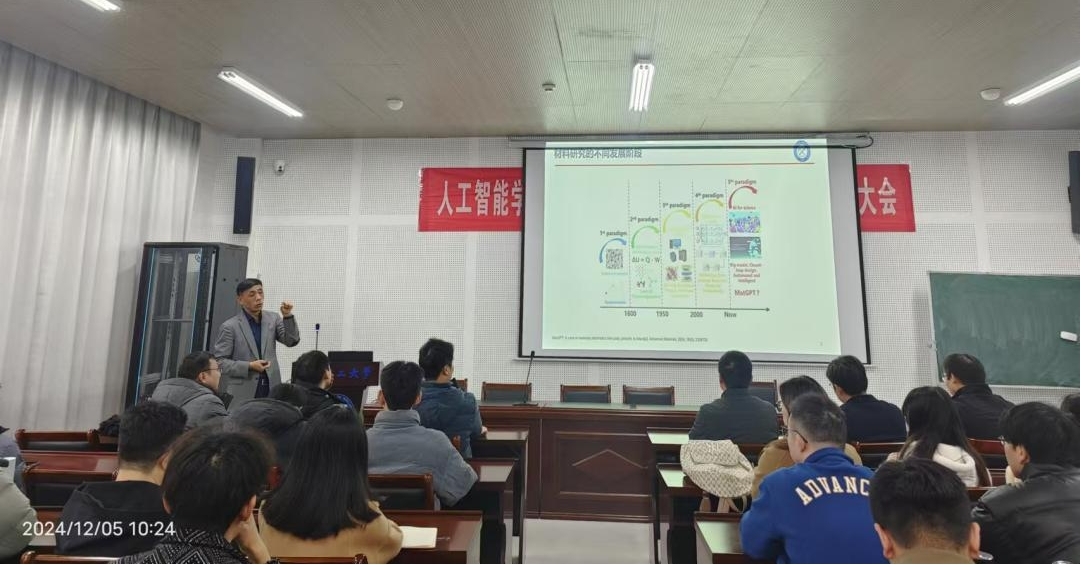李长河院长首先向大家介绍了王文新教授在科学研究和创新创业方面取得的各项荣誉成果。王文新教授作了题为《AI在材料研究中的应用》的学术报告,报告围绕人工智能赋能材料科学和医学等学科交叉研究进行探讨,包括AI辅助材料筛选、AI辅助材料表征、AI辅助材料开发简单流程及在材料开发中AI技术的主要挑战,并通过实例详细阐述了AI技术在材料开发中的应用。