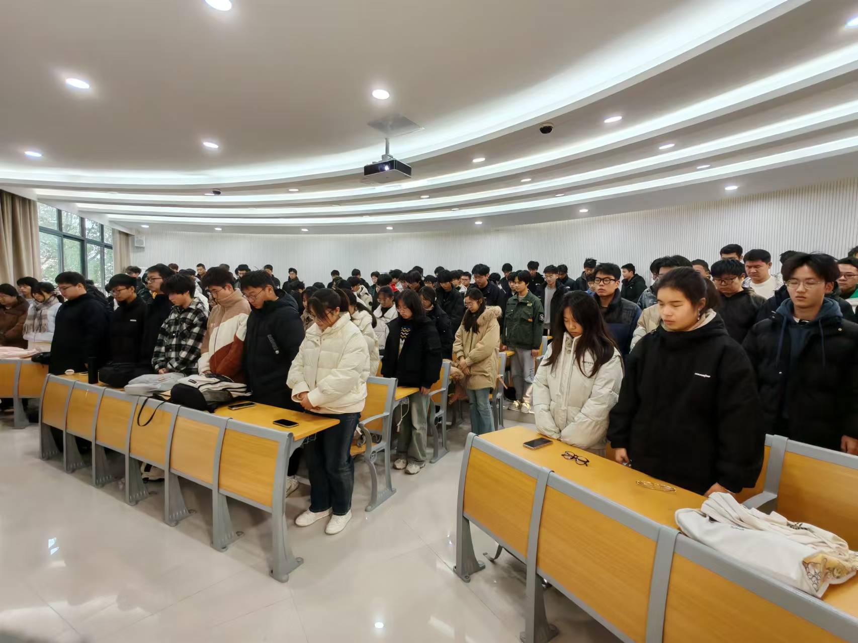 上午10点01分,全体党员教师和参会同学集体默哀一分钟,向南京大屠杀死难者和英勇牺牲的先烈表达哀思。
