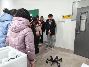 为了让小同学们在轻松愉快的氛围中掌握技能和知识,确保科普教育内容既有趣又能引导同学们思考,人工智能学院实验中心的老师们做了精心准备。活动伊始,实验中心副主任丁云霞和胡锐、黄建超、李康康等老师为来访师生,分项目细致讲解了移动机器人、六足蜘蛛机器人、履带式搬运机器人、感应机械手装置等仪器设备及其原理并进行了操作演示,同时针对同学提出的问题现场答疑解惑。