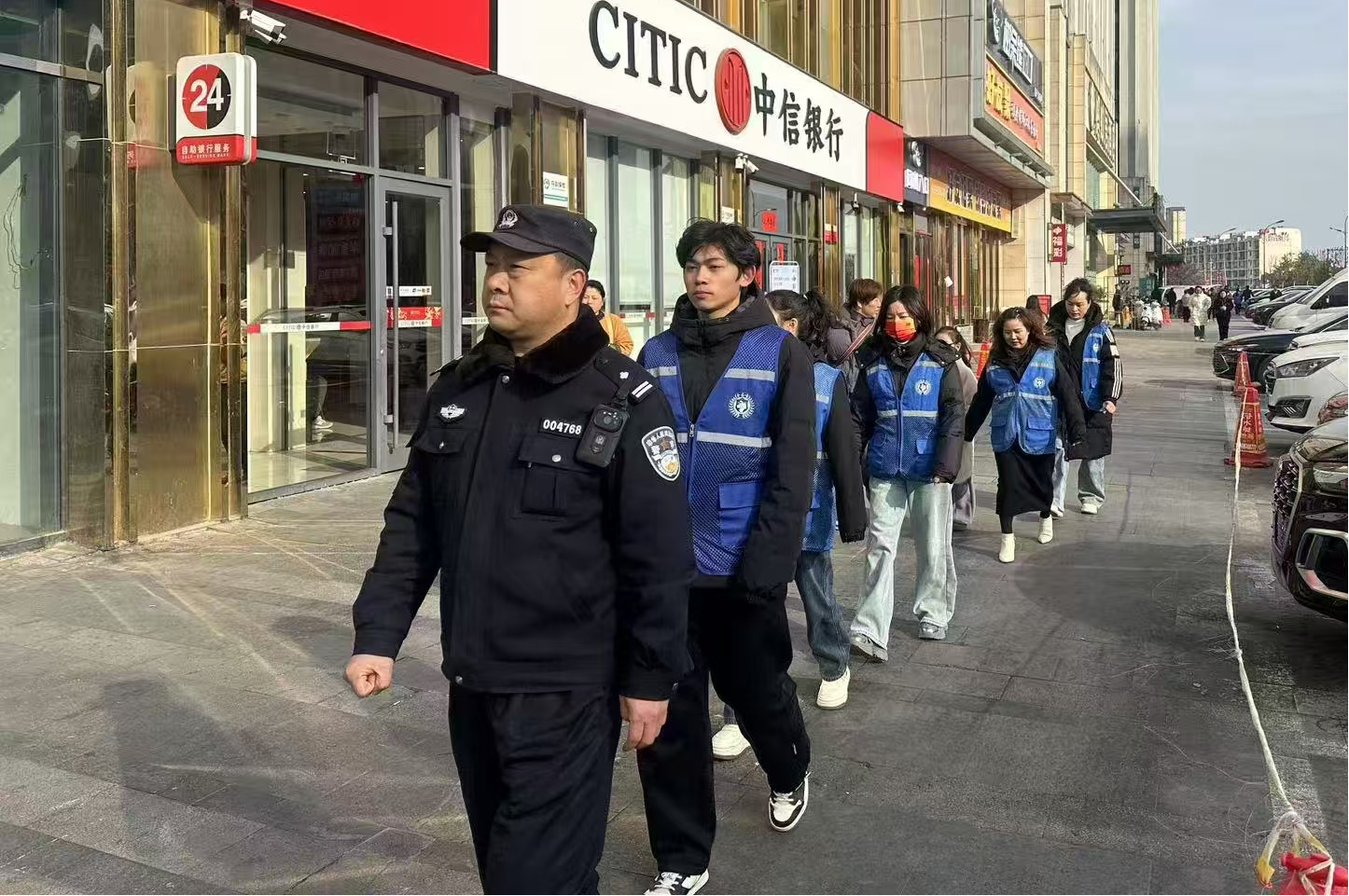 春节期间,智科H24-2班的大学生志愿者们,积极参与社区民警组织的反电诈宣传活动,以身穿蓝色马甲的志愿者身份,与民警携手在社区内开展巡逻,为构建无诈社区贡献青春力量。