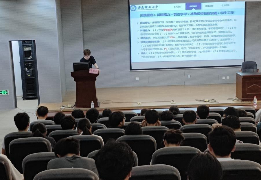 分享会上,三位学生代表围绕院校选择、复习规划、心态调整等展开分享。保研至东北大学的绳星辰重点介绍了保研流程与材料准备要点;考研本校的朱雪晴建议以稳扎稳打夯实基础+真题训练突破难点+模拟考试查漏补缺的方式复习;调剂回本校的汪涵则强调院校选择的重要性,并介绍调剂信息筛选技巧与心态调整方法。现场学生积极提问,围绕备考、时间管理和择校等问题展开交流。