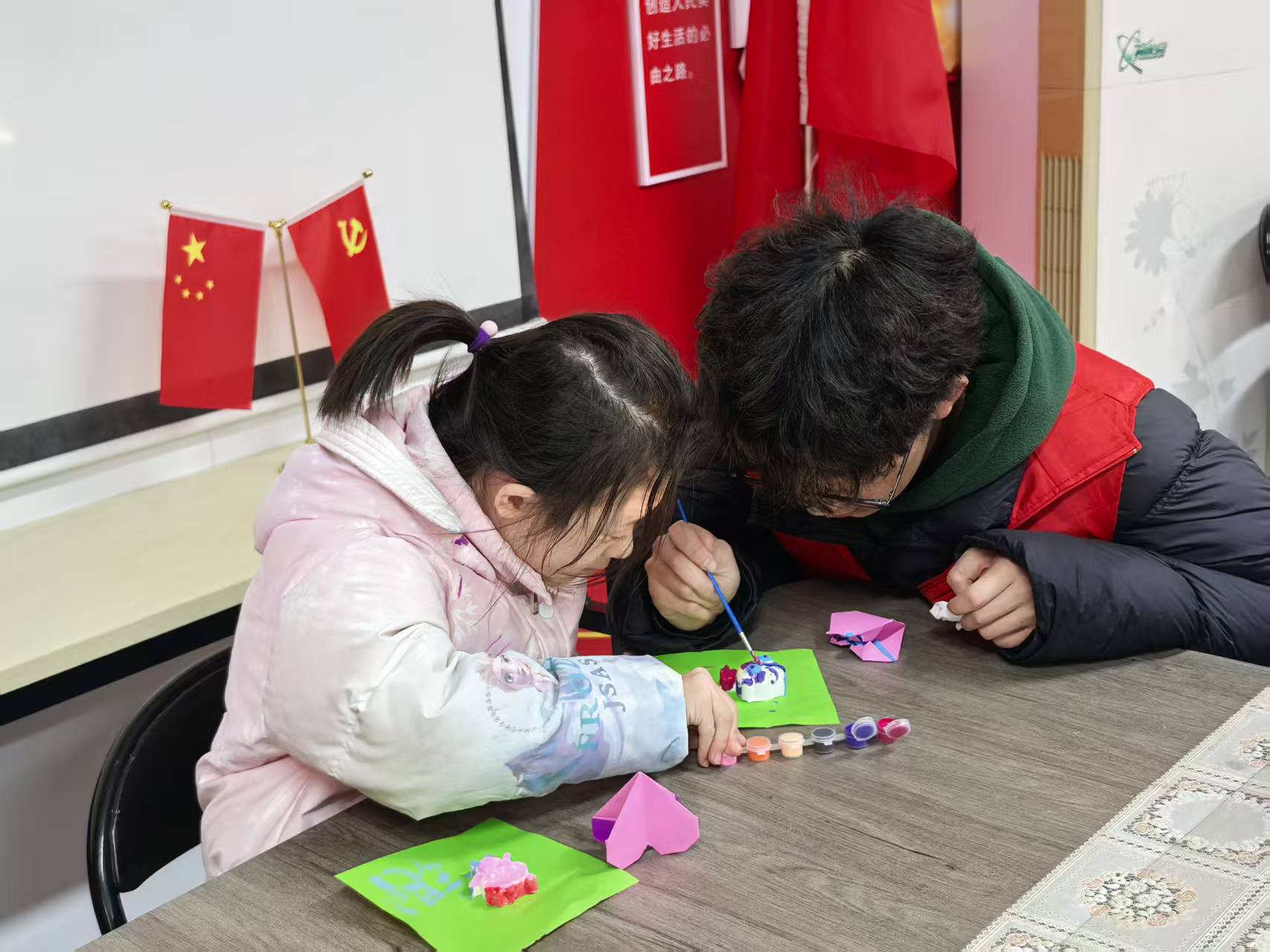 孩子在志愿者的帮助下绘制石膏玩偶