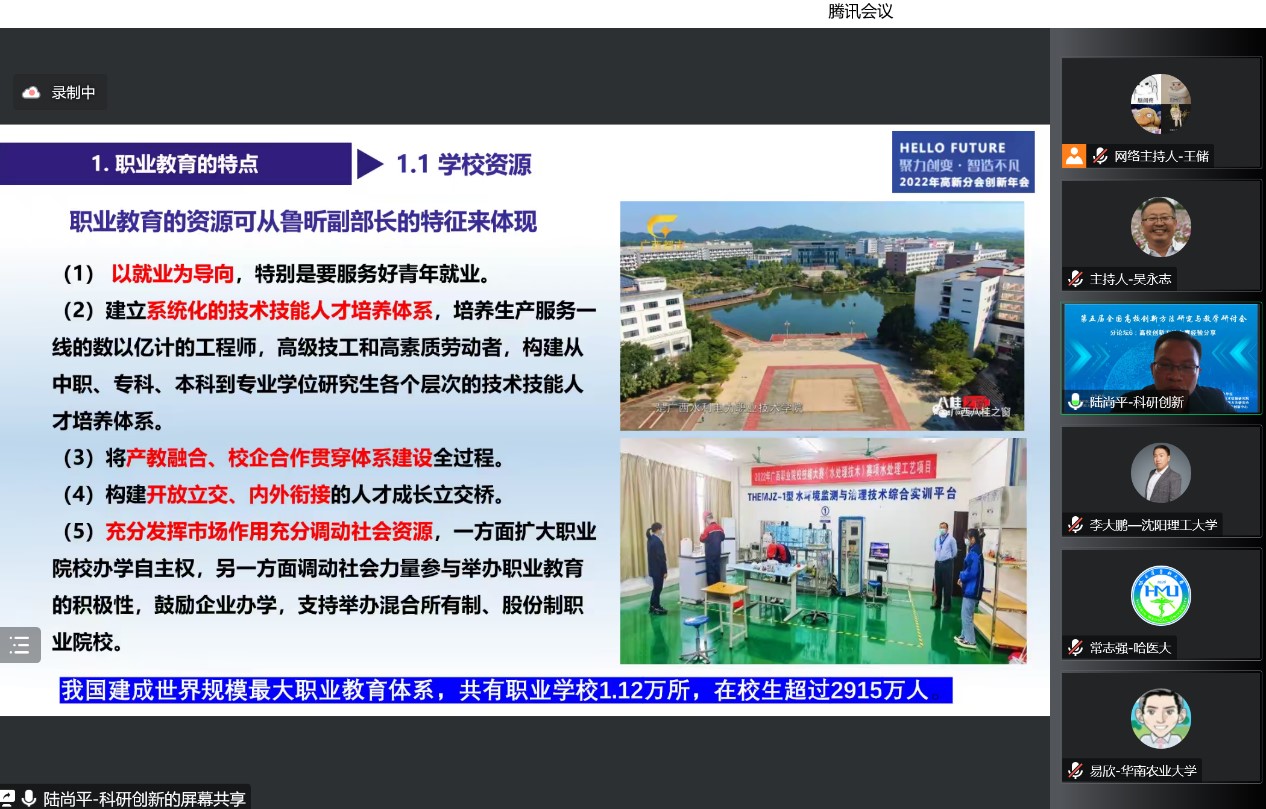 第六位分享嘉宾是广西水利电力职业技术学院的陆尚平教授,他报告的题目是《基于TRIZ理论的职业院校创新创业教育与平台搭建探索》。陆尚平教授从职业教育的特点、创新创业教育、TRIZ与职业院校创新创业教育、平台搭建探索、思考与展望等方面进行了分享。