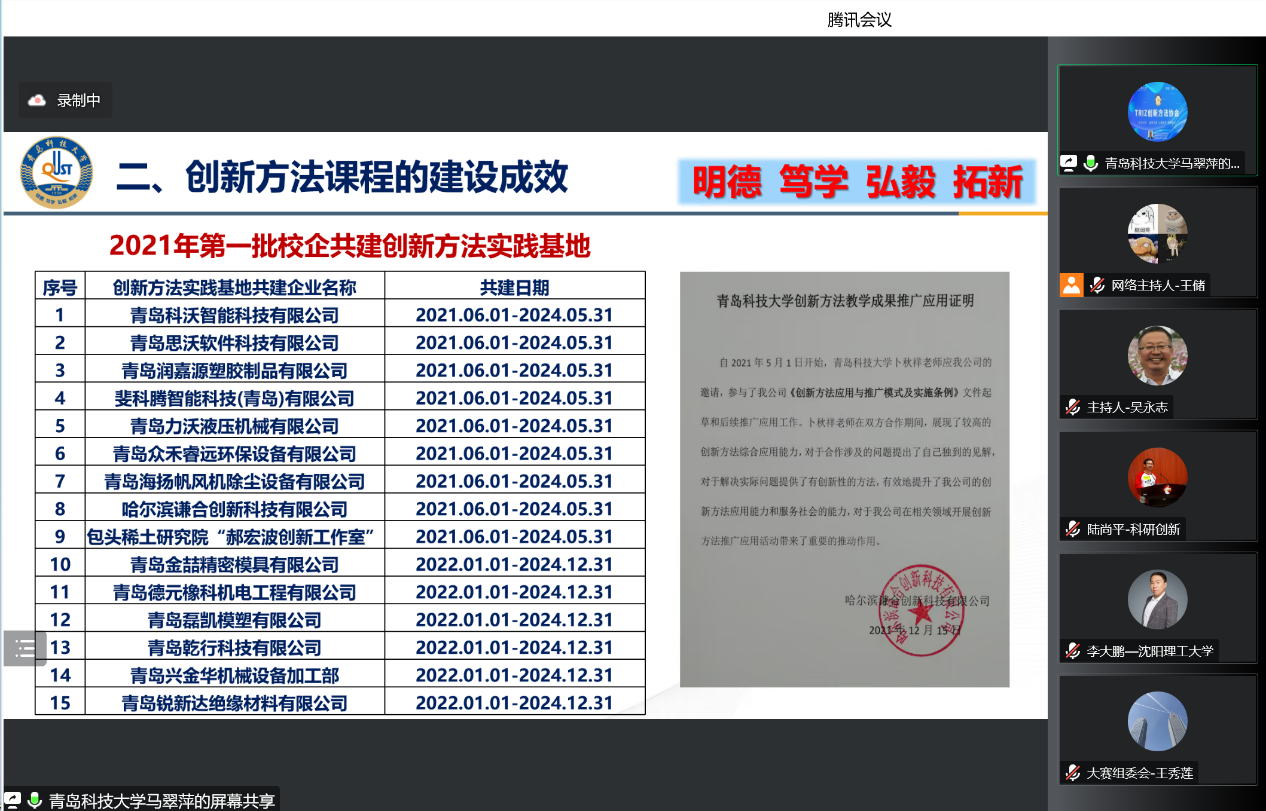 第三位分享嘉宾是青岛科技大学教务处处长兼海洋科学与生物工程学院院长马翠萍教授,她的报告题目是《厚积薄发,践行科大精神—基于OBE理念的我校创新方法课程与竞赛融合体系建构》。马翠萍教授从学校及个人简介、创新方法课程的建设成效、创新方法学科竞赛的成长和课赛融合体系的反思及推广等4个方面对青岛科技大学创新方法课程建设推广取得的成效进行了介绍。