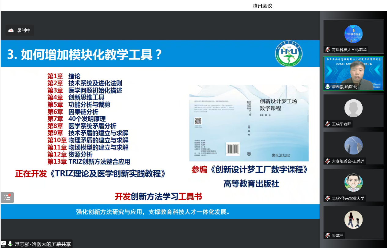 第四位分享嘉宾是哈尔滨医科大学的常志强老师,他的报告题目是《探索“新医科”创新方法型医学生培养路径》。常志强老师从“顺应时代:哈医大创新之路与时俱进”、“医创融合:创新方法医学化研究与实践”、“大赛育人:提升医学生创新方法应用能力”三个方面,对哈尔滨医科大学在创新方法课程建设和创新方法师资建设取得的成果进行了总结,并分享了指导医科类大学学生参赛的经验。