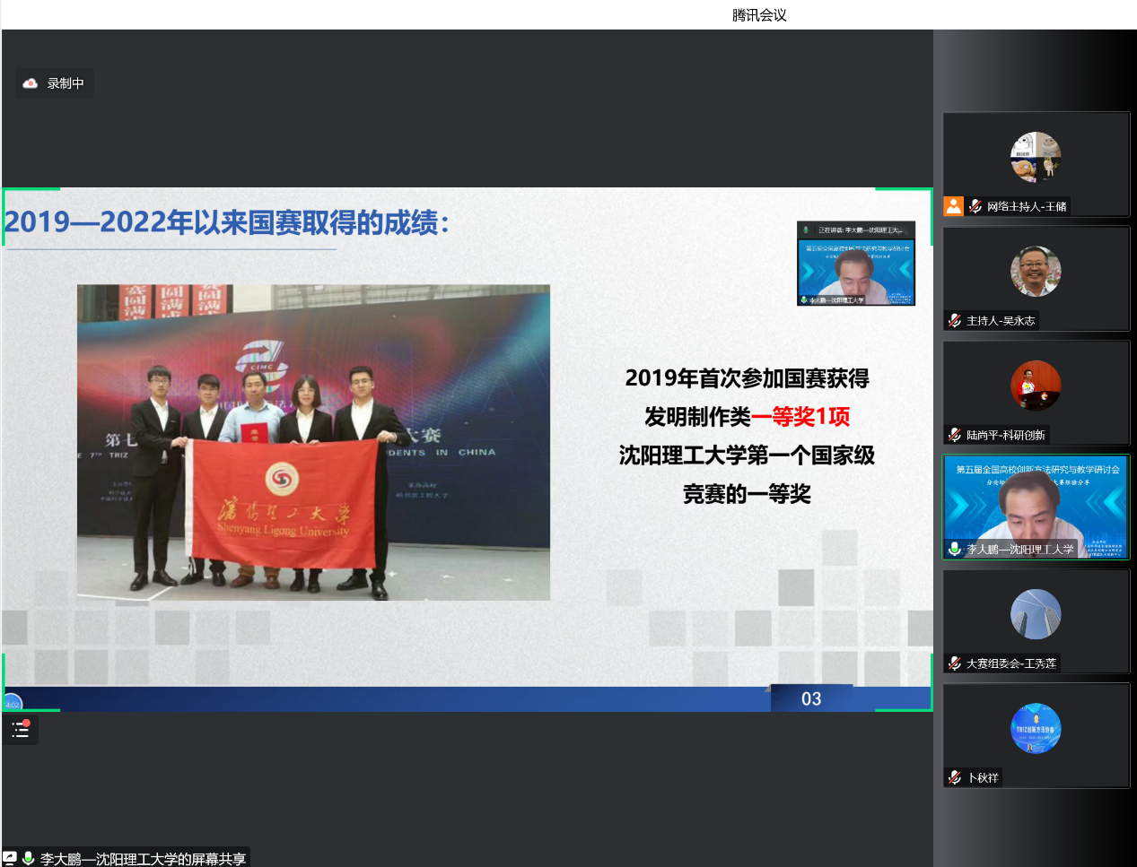 第二位分享嘉宾是沈阳理工大学的李大鹏教授,她报告的题目是《以大赛为引领构建多层次创新方法教育教学体系》。李大鹏教授首先介绍了学校参加中国TRIZ杯大学生创新方法大赛以来取得的成绩,师资团队和大学生TRIZ爱好者队伍。其次,李教授分享了“选修课+集训营”模式、“金字塔团队培育模式”、“3+2+1学生团队建设模式”等学校的创新方法推广教育模式。最后,李教授阐述了目前学校创新方法推广过程中存在的问题和困境,并给出了相应的解决方案。