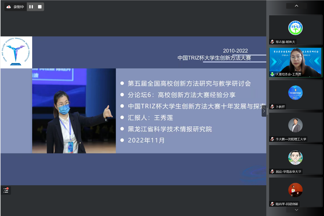第一位分享嘉宾是黑龙江省科学技术情报研究院的王秀莲副研究员,她的报告题目是《中国TRIZ杯大学生创新方法大赛十年发展与探索》。王老师从大赛综述、赛事调整、大赛成效、媒体报道等6个方面对大赛的发展历程进行了整体介绍,并对大赛今后的发展方向和未来工作进行了规划。