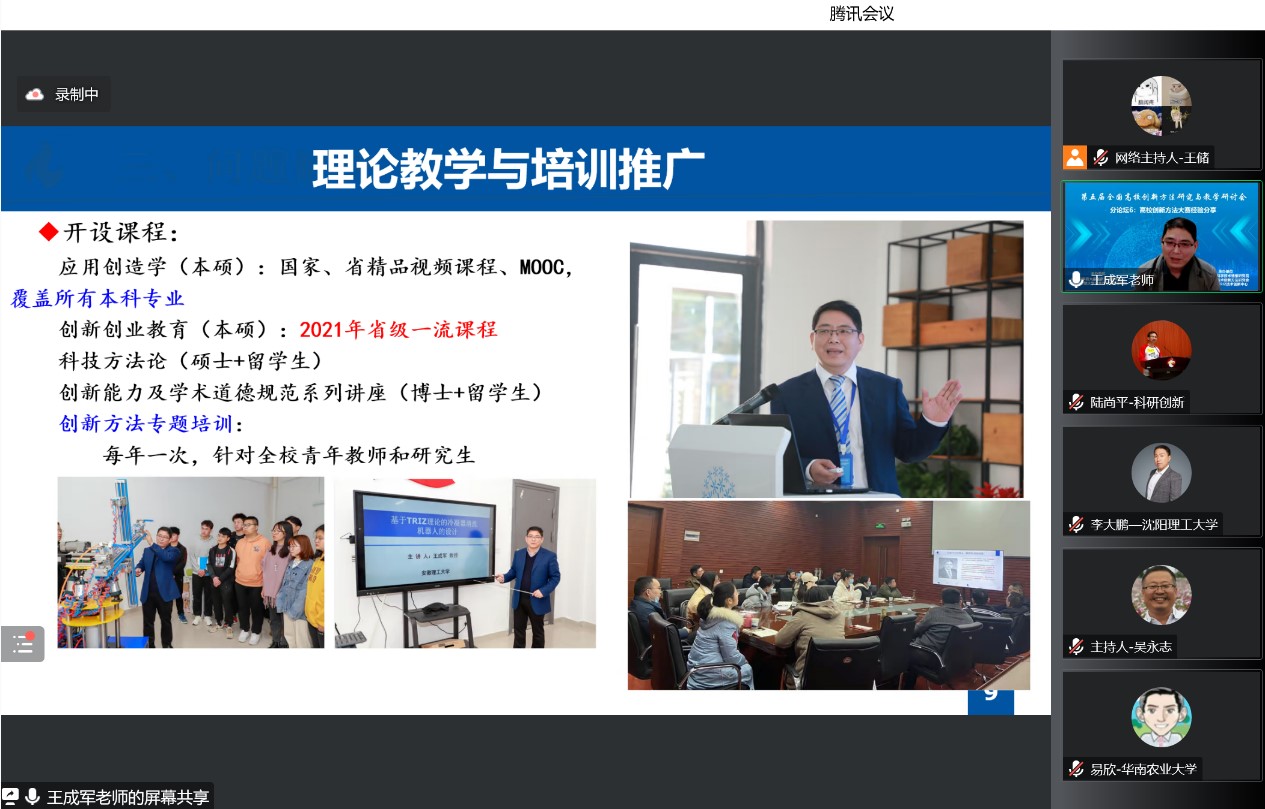 第七位分享嘉宾是安徽理工大学王成军教授,他报告的题目是《基于创新方法大赛的研究生创新能力培养实践》。王成军教授从创新方法理论研究、理论教学与培训推广、创新方法大赛组织、学科建设与人才培养应用、推广应用实践等角度,分享了安徽理工大学参加创新方法大赛的经验和创新人才培养的经验。